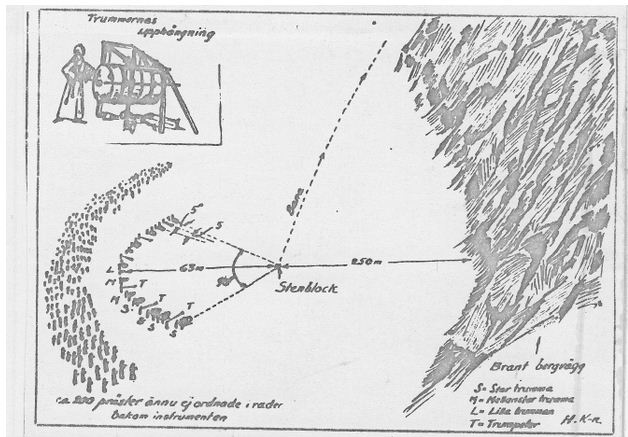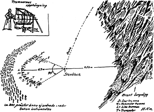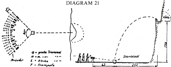 were set in an arc of 90 degrees at a distance of 63 meters from the stone slab. The radius of 63 meters was measured out accurately. The musical instruments consisted of 13 drums and six trumpets.