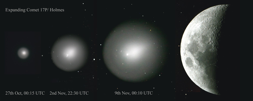 1 and 4 show Comet Holmes as a circular disk, in reality a sphere, of dust with a well defined explosion front.