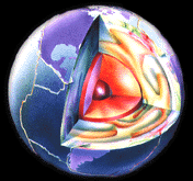 - Earth's layered structure -- a relatively thin crust of mobile plates, a solid mantle with gradual overturning movement, and the outer and inner core of molten and solid iron.*