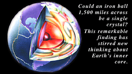 Could an iron ball 1,500 miles across be a single crystal? Unheard of until this work, the idea has prompted realization that the temperature-pressure extremes of the inner core offer ideal conditions for crystal growth. Several high-pressure laboratories have experiments planned to test these results. A strongly oriented inner core could also explain anomalies of Earth's magnetic field, such as tilted field lines near the equator. "To do these esoteric quantum calculations," says Stixrude, "solutions which you can get only with a supercomputer, and get results you can compare directly with messy observations of nature and help explain them -- this has been very exciting."