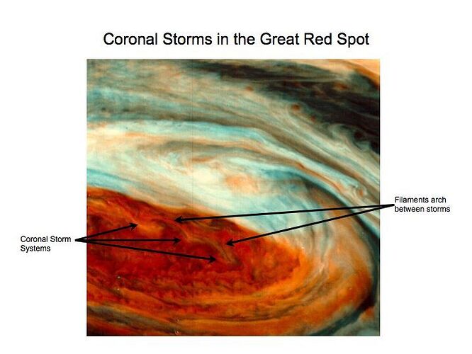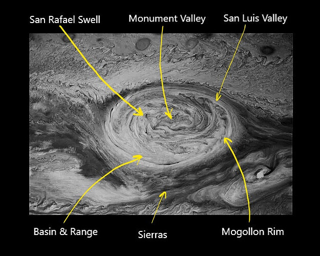 Each of these features – the Great Basin meso-cyclone, the multi-vortex cyclone over the Colorado Plateau, with arching colonnades of meso-cyclone/cyclone pairs can be identified in the Great Red Spot on Jupiter. It’s because the shapes and actions of the wind are driven by the fractal process of charge diffusion in the planetary circuit. The difference in chemistry, and thermodynamics of Jupiter’s atmosphere compared to Earth’s doesn’t make much difference, because circuits are the forcing mechanism in Nature.