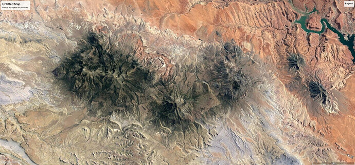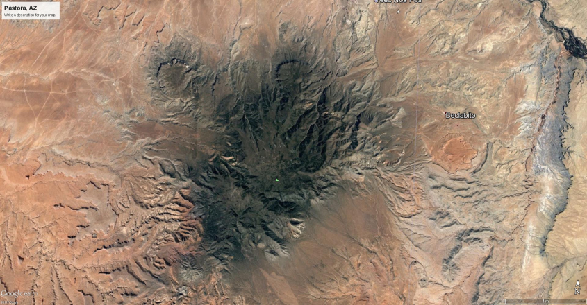 The circular craters and mesas in the images were formed by lightning, while the mountain was expanded by wind borne dust accumulating around them. There are several examples of mountains with these features in the Four Corners region.