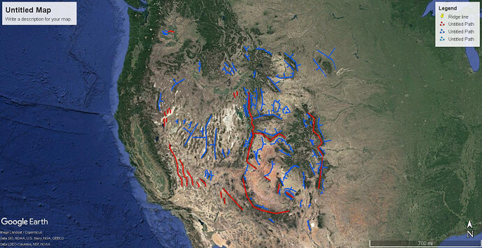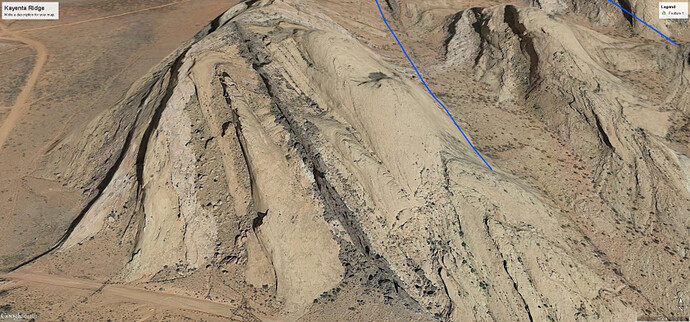 So, it is possible by looking at the land to deduce wind patterns. Following this method, the next image shows the Colorado Plateau with wind formed pressure ridges annotated by blue lines. These are pressure ridges formed perpendicular to the wind. Each line is drawn parallel to a pressure ridge, and perpendicular hash marks indicate wind direction. Red lines indicate pressure ridges formed parallel to the wind, at shear zones between conflicting winds.
