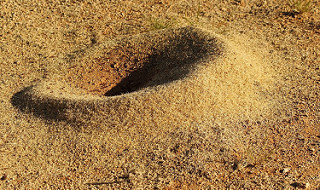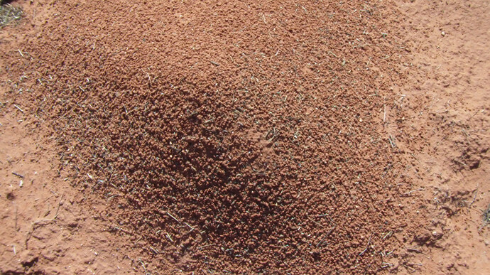 The form is like an anthill, but these are not anthills. Ants dig rock from below ground and pile it outside the hole. These are built the opposite. The sand is swept-up from the surroundings, leaving a pile at the center of a crater. Besides, these don’t have ants, or ant-holes.