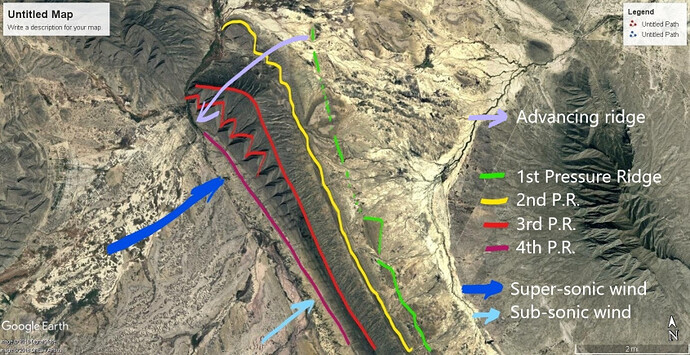 Large triangular buttresses at one end of the large (red) ridge shrink in amplitude with geometric progression until they almost vanish, indicating the jet-stream velocity transitioned from supersonic to near subsonic velocity along the wind-front of this dune. The faster jet-stream region advanced the growth of the dune, depositing material faster and pushing the shock-wave into the wind. It advanced the ridge line into the wind (violet) and built this portion of the mountain thicker, taller, with large amplitude reflected shocks forming bigger buttresses.