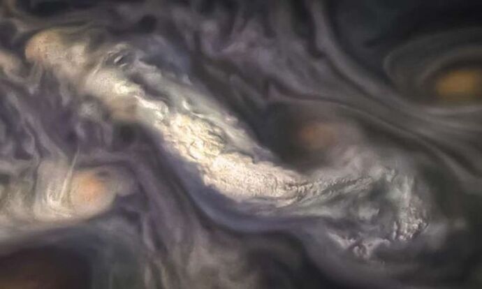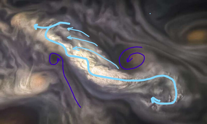 The turbulent kinks are fractal forms, so taking another step back reveals the fractal crab-claw shape emerging at a larger scale. The smaller feature with the crater shown above is nested within this larger repetition of the wind pattern shown next, aligned along the same axis. Nested fractals are very evident in Jupiter’s clouds as well.
