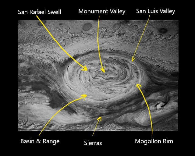 Between the super-volcanic maw of Yellowstone and the strato-volcanic cones on the Mogollon Rim sits the Colorado Plateau, where the winds mixed in a plasma cyclone. The meeting of the unipolar winds was the earth-sized equivalent of the Great Red Spot on Jupiter – a sustained and violent storm, charged with electricity and bent by magnetic fields – a storm beyond any Biblical description.