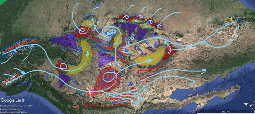 Red areas are updrafts, yellow are downdrafts, blue are precipitation footprints. Adding this layer of information to the map of pressure ridges, produces a wind map of the Colorado Plateau and Rocky Mountains that looks like this: