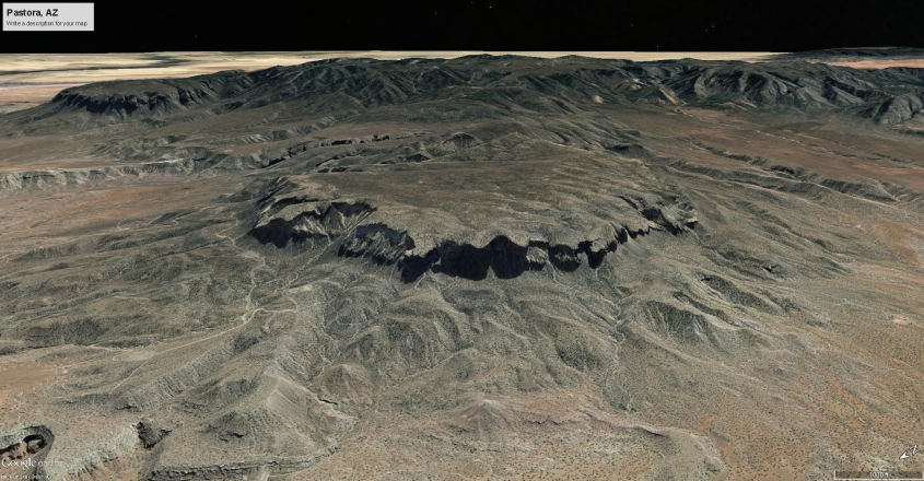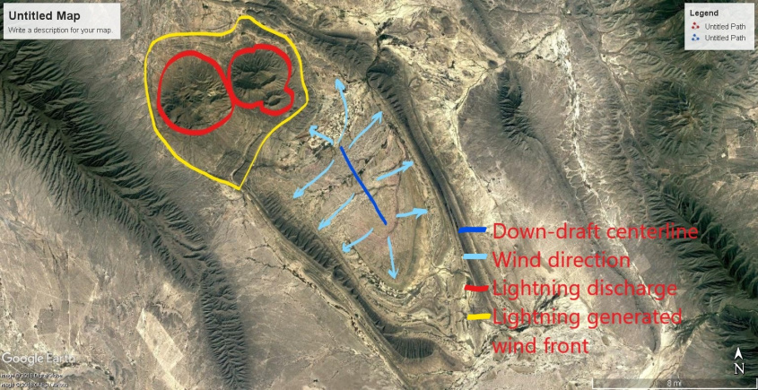 The frame is broken, but the lenses are intact. Downdraft at 90 degrees to updraft. In the broader perspective, one can see the circular rotation imprint continues along Black Mesa and defines the eye of the storm.