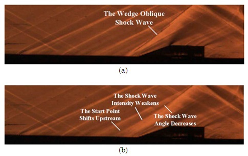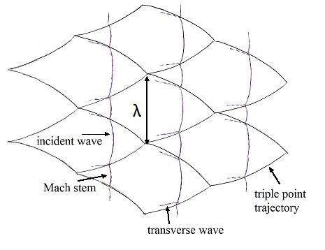 A protrusion in the wind changes the wind vector and angle of reflection, and forces the shock wave to grow backward into the jet stream. This deflection of the wind creates low pressure at the leading edge of the protrusion which deposits buttresses in the shape of the triangular wave-form.