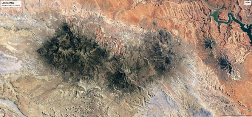 Note, the San Juan River arcs around the downdraft after it passes through the center of the updraft, just as the tributary of the Green wrapped around the Capitol Reef downdraft crater and then shot through the heart of the San Rafael Dome. These are the fractal forms of surface conductive charge diffusion, or “arc blast”, and the rivers are part of it (which will be discussed in future articles).