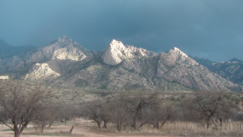 Left to right, the conical head of a fulgamite and concentric rows of granite buttresses. The dark vegetation band below rocky buttresses shows consistent angle of dip created by wind blown deposition – Buster Mountain, southern Arizona