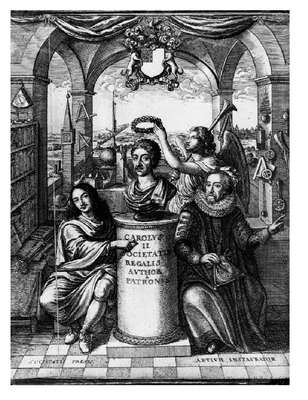Frontispiece, designed by John Evelyn, to the official history of the Royal Society, published in 1667. Francis Bacon is depicted as the founding father. He sits under the wing of an angel in a way that echoes the closing phrase of the Fama Fraternitatis of the Rosicrucians.