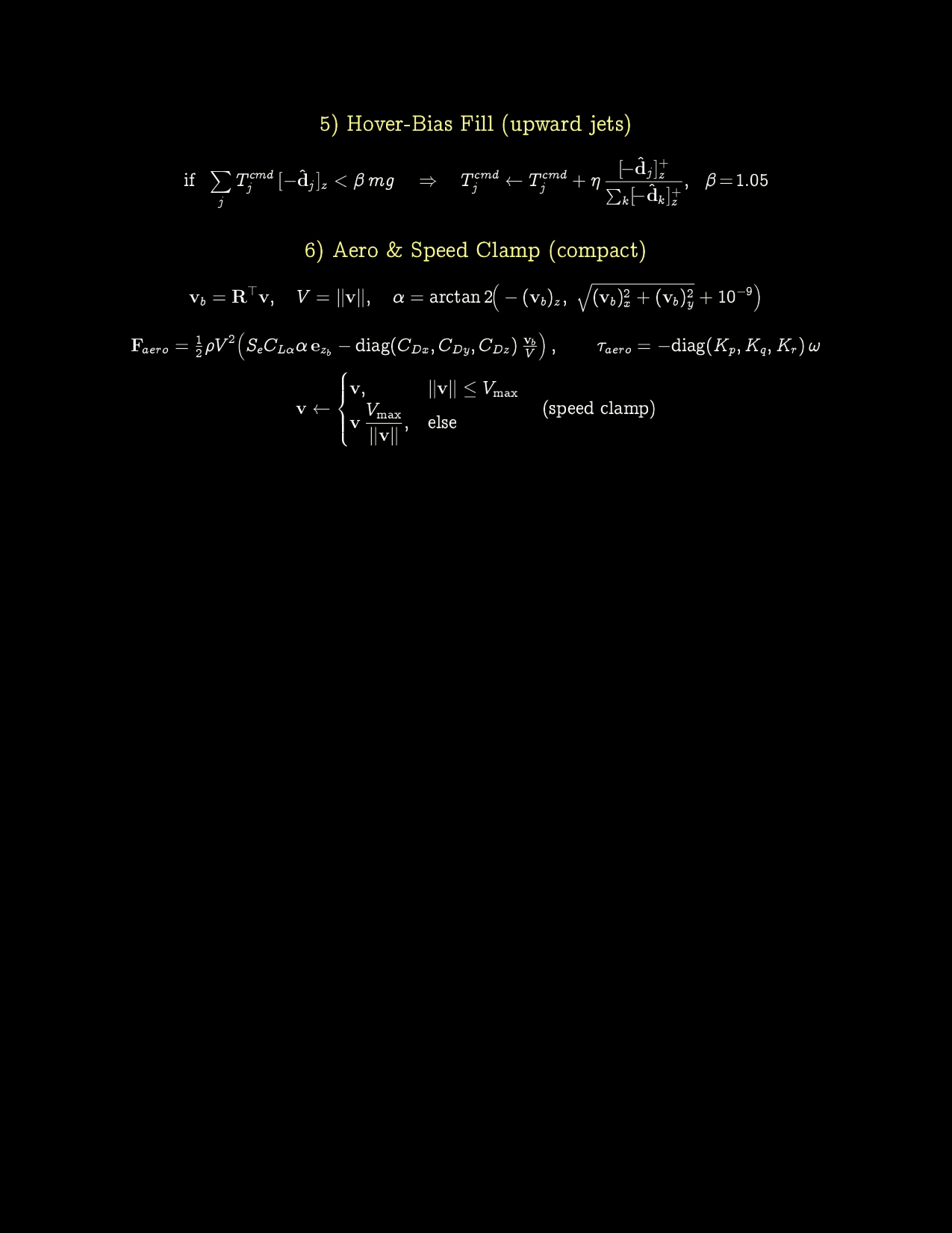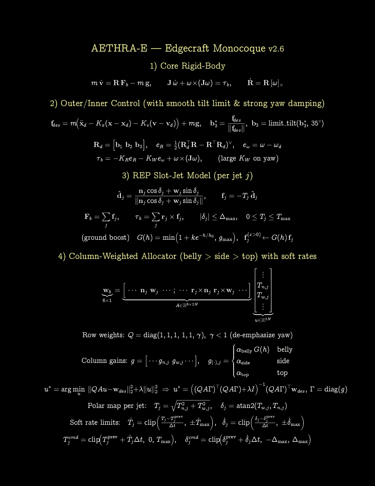 The mathematical framework of the physics and control system of the drone concept. The piecewise functions for the hull/fuselage are too lengthy to share here.